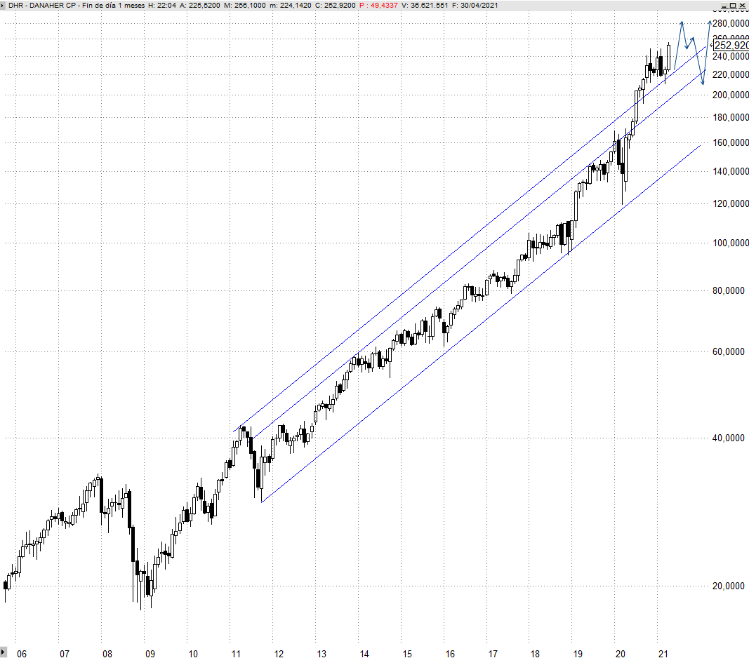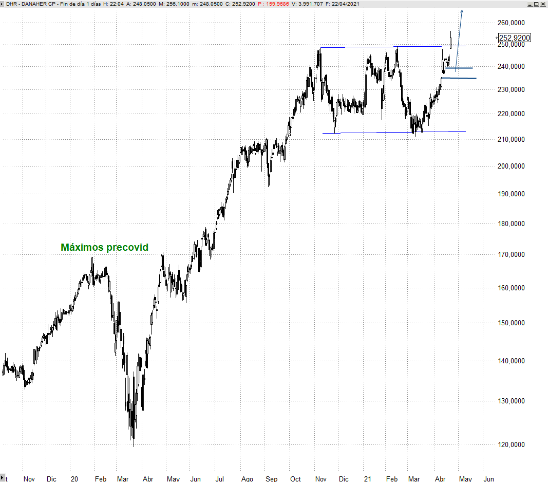 Esta amenaza no frenó ayer el impulso de Danaher Corporation, que nos deja una foto alcista que refuerza un escenario de continuidad en subida libre absoluta. Logró marcar ayer nuevos máximos históricos superando su última fase consolidativa tras presentar cuentas del primer trimestre mejores de lo esperado. Hablamos de un conglomerado estadounidense que diseña, fabrica y comercializa productos y servicios médicos e industriales en todo el mundo.