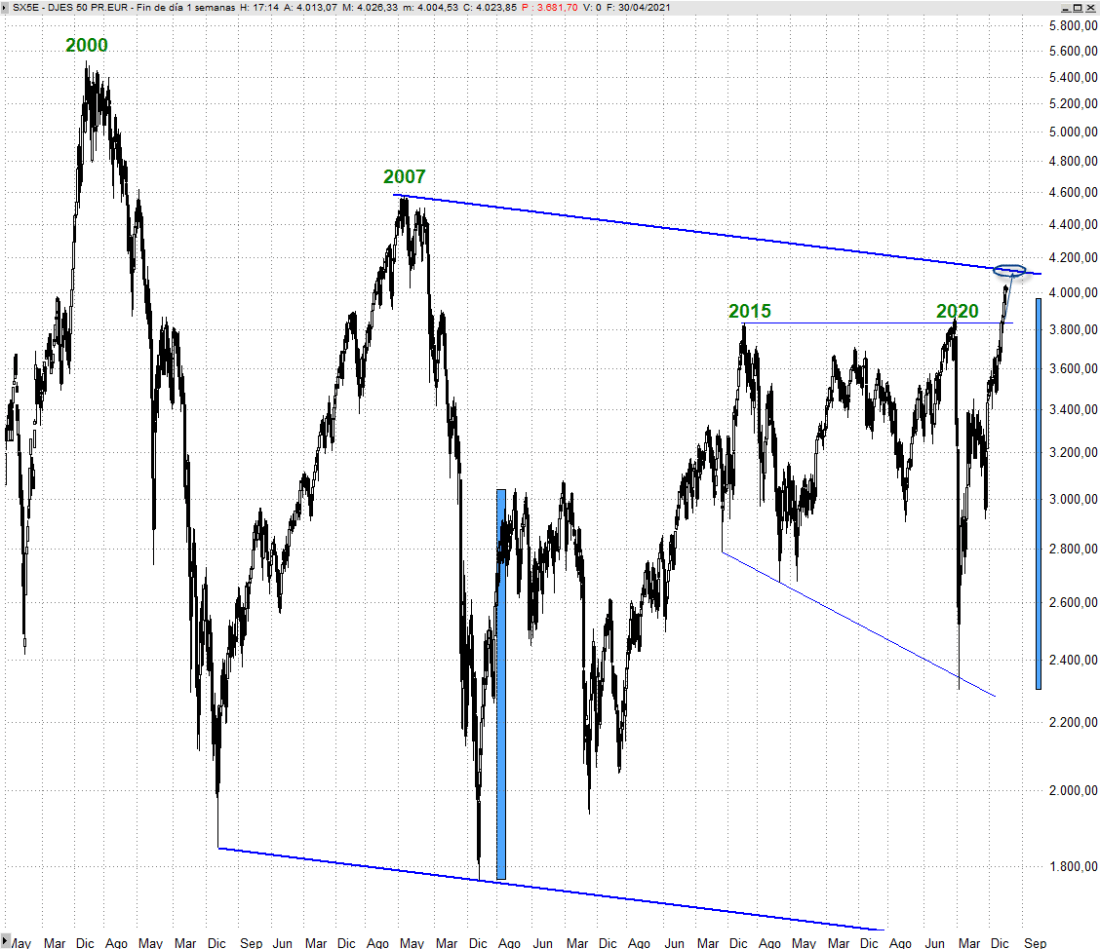 Esperamos que una vez que finalice la actual consolidación veamos nuevos máximos crecientes que podrían dirigirse hacia los reiterados 4.095 puntos del Eurostoxx 50, por donde discurre el techo del amplio canal lateral que mostramos en el chart semanal adjunto. Su superación sería un gran argumento de fortaleza de cara al medio y largo plazo y abriría la puerta a una recuperación de los máximos de la anterior gran crisis, los 4.572 puntos establecidos en 2007.