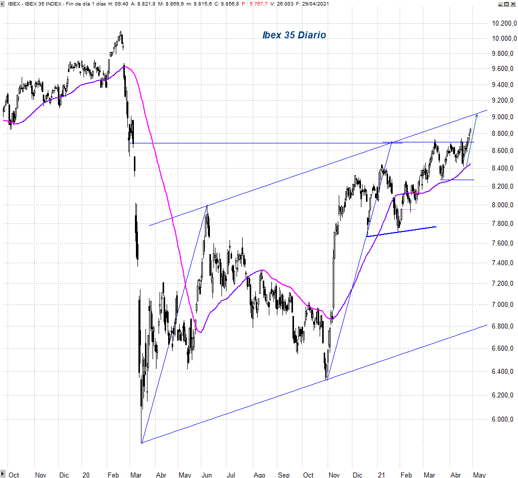 En apertura ha abierto un hueco alcista y marca nuevos máximos crecientes en la actual fase, que le sitúan ya a tiro de piedra del techo del canal y del objetivo que venimos señalando en reiterados análisis, los 9.080 puntos. Por encima podría incluso estirar los avances hacia los 9.420 puntos, pero más allá de eso lo vemos complicado sin que forme una consolidación o corrección más amplia.