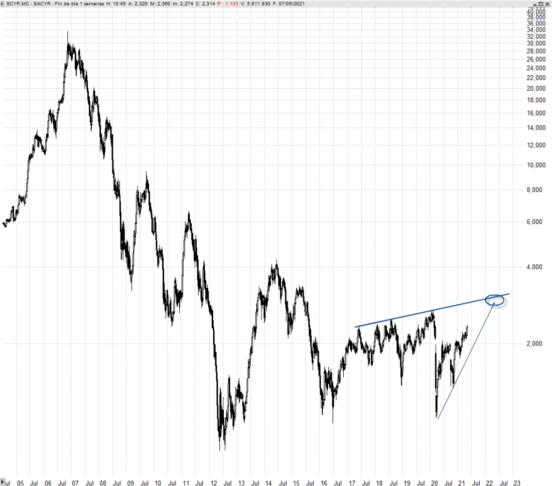 Ampliando un poco las miras entendemos que es cuestión de tiempo para que se dirija hacia la zona de resistencia creciente que aparece sobre los 2,95/3,35 euros, cuya superación es lo que exigimos para que tome cuerpo una gran reestructuración alcista a plazos largos. No olvidemos que hablamos de un título que ha perdido gran parte de su valor desde los máximos de la anterior gran crisis financiera e inmobiliaria que estalló en 2007. Lo que en ningún caso debería ya de ceder para seguir confiando en sus opciones son los 1,80/1,70 euros.