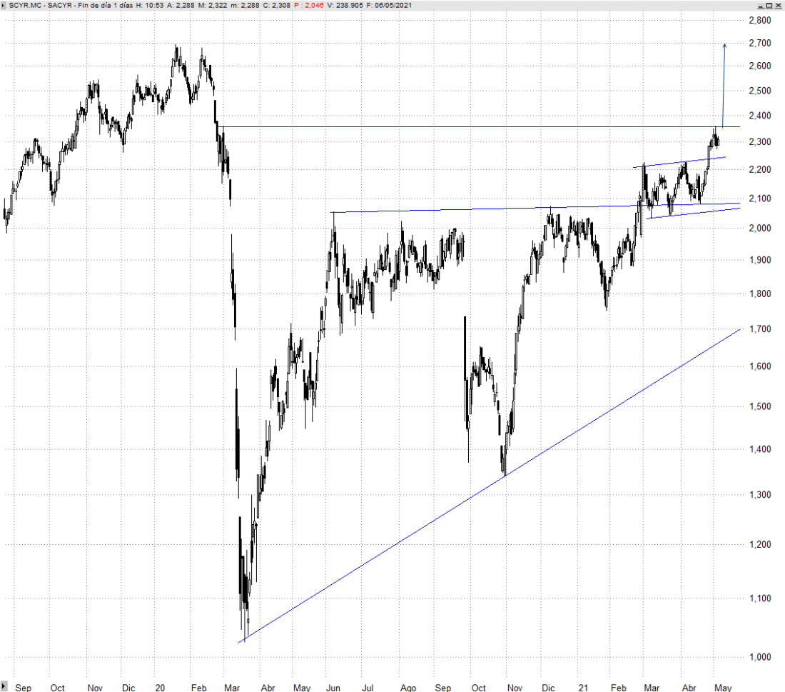 Lo más destacable en los últimos meses desde el punto de vista técnico es que se ha situado sobre el entorno resistivo de los 2,05 euros, ahora soporte, y se mantiene en disposición de recuperar la totalidad de la ‘caída Covid’ originada en los 2,69 euros, que se encuentra a aproximadamente un 16% desde los niveles actuales.