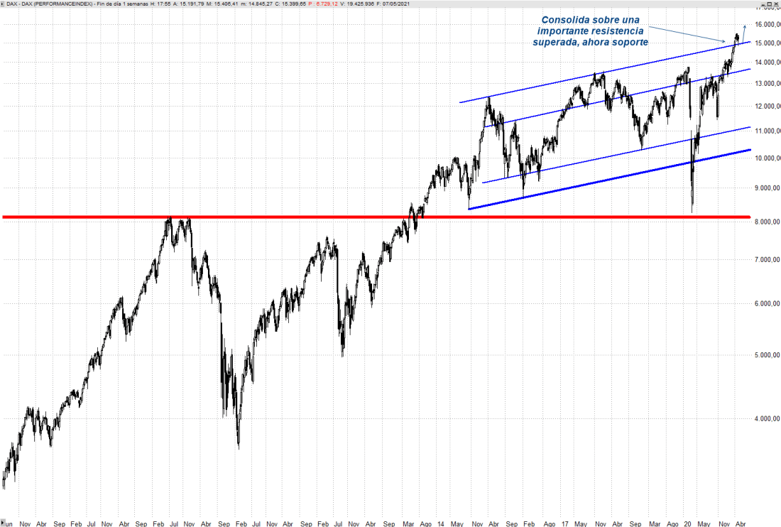 El Dax 30 alemán, índice total return que incorpora dividendos a diferencia de los índices tradicionales, también se encuentra en máximos históricos consolidando sobre una resistencia creciente superada semanas atrás, lo que invita también a ser optimistas de cara a próximas semanas.