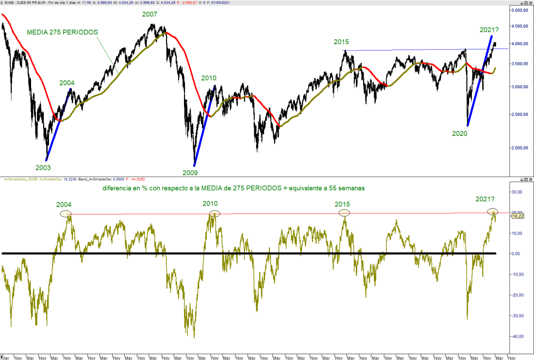 A día de hoy la sobrecompra en precio es la mayor amenaza a la que se enfrentan los inversores, pero mientras no tengamos evidencias de agotamiento nuestro deber es confiar en la continuidad de la tendencia. Se suele hablar de sobrecompra únicamente en términos de precio, pero en los gráficos tenemos dos ejes, uno con la variable precio y otro con el tiempo. El factor tiempo es olvidado por muchos a la hora de cuantificar la sobrecompra o sobreventa. Pues bien, en términos temporales no existe tal sobrecompra, por lo que, aunque las subidas encuentren cada vez más dificultades, las bolsas se encuentran en disposición de seguir subiendo o al menos consumir tiempo en lateral sin que se produzca una corrección en profundidad.