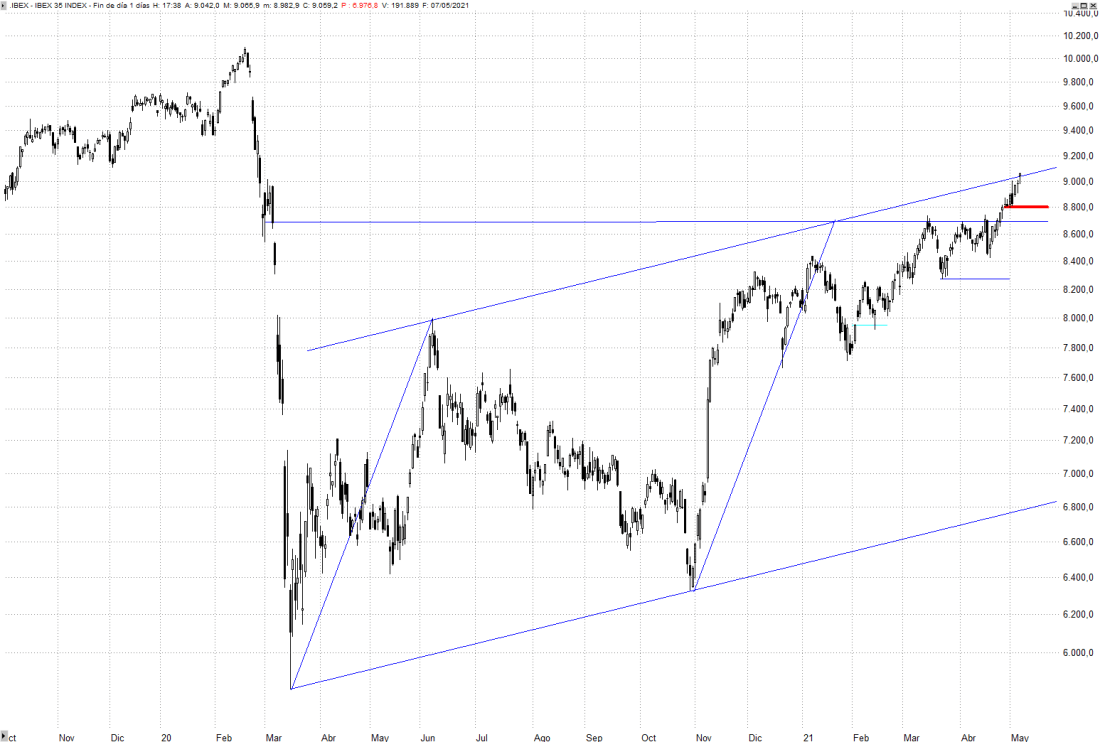 Cabe destacar que el selectivo Ibex 35 ha alcanzado prácticamente el primer objetivo que venimos señalando en los últimos meses en los 9.080 puntos, por donde además discurre la resistencia creciente que encuentra en el techo del canal que desarrolla desde los mínimos de hace ya más de un año. Su superación abriría las puertas a los 9.420 puntos y posteriormente a los 10.100. Sería un gran paso a favor de su reestructuración alcista a plazos largos. El sector bancario europeo está teniendo un buen comportamiento tras una consolidación de varias semanas y apunta a más subidas, lo que favorecerá probablemente la continuidad alcista del Ibex sobre el techo del canal.