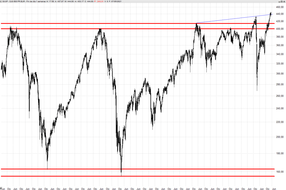 Además del Ibex 35, del Dow Jones Industriales y el S&P 500 en máximos históricos, vamos a destacar la actuación del Eurostoxx 600. Está logrando situarse, no solo sobre los máximos del pasado año, sino también sobre los máximos de los años 2000 y 2007. Confirma por tanto un gran giro alcista a plazos largos que sugiere que cualquier corrección debe de ser aprovechada para comprar bolsa europea. A corto plazo es probable que alcance los 449/450 puntos y si los supera abriría la puerta a una extensión de las subidas hacia objetivos más ambiciosos sobre los 490 puntos, un 10% adicional desde los niveles de cierre del viernes. Mientras no pierda los 432 puntos no hablaremos de debilidad.