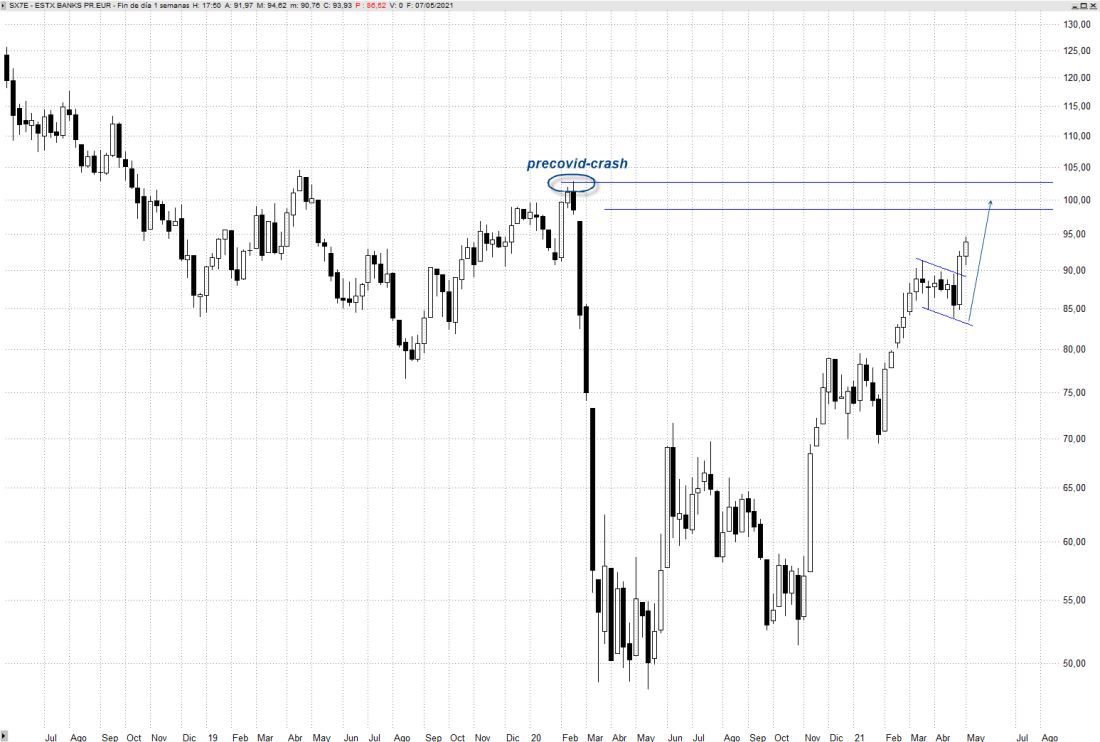 Rompiendo los 450 puntos el Eurostoxx 600 ganaría enteros la continuidad del Eurostoxx 50 hacia los máximos de 2007, hacia los 4.500 puntos, que es su siguiente gran objetivo una vez recuperados los máximos precovid-crash, los 3.867 puntos. La sobrecompra en precio no lo pondrá nada fácil, pero mientras no pierda al menos los 3.920 puntos no habrá ningún signo de debilidad.
