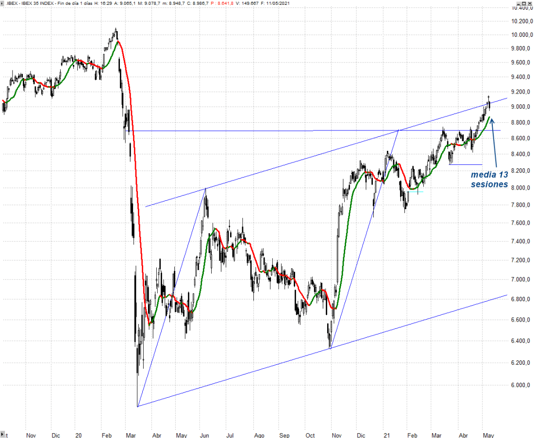 En el caso del Ibex 35, una vez superado ayer el techo del canal que viene definiendo desde los mínimos de marzo pasado no hablaremos de debilidad mientras no pierda al menos los 8.910 puntos. Ni siquiera ha tenido contacto con su media de 13 sesiones después de 11 consecutivas. Su convergencia con la media debe ser vista como una simple consolidación de corto plazo. En todo caso, para tener confirmación de que una corrección o consolidación mayor está en marcha lo mínimo sería que perdiera los mínimos de la semana pasada, los 8.795 puntos.