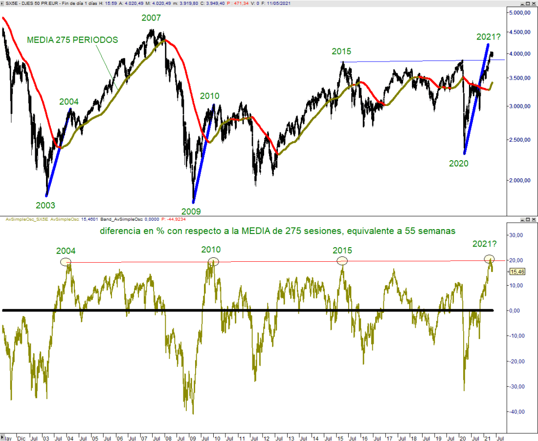 El Eurostoxx 50 como principal referencia europea está poniendo a prueba la base de la consolidación que desarrolla en las últimas semanas. Ceder el entorno de los 3.920/3.900 puntos complicaría mucho su continuidad alcista sin corregir en mayor medida, máxime con la sobrecompra histórica que acumula, muy pocas veces vista en los últimos 20 años. Por el momento seguimos hablando de una simple consolidación pendientes de lo que acontezca al otro lado del Atlántico. A pesar de las dificultades, los alcistas siguen al mando y se mantienen intactas las posibilidades de que alcance los 4.095 puntos, que es el primer objetivo destacable que venimos señalando en los últimos meses.