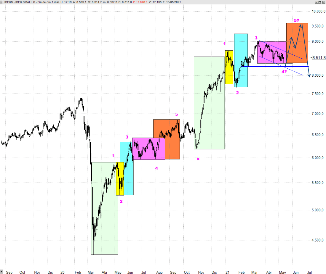 Pistas que apuntan en esta dirección las obtenemos también curiosamente en el índice Ibex Small Cap, que viene desarrollando un doble patrón ascendente de 5 segmentos. Podría estar completando la onda 4 del segundo tramo alcista destacable para desplegar una última onda 5 antes de que forme una corrección significativa.