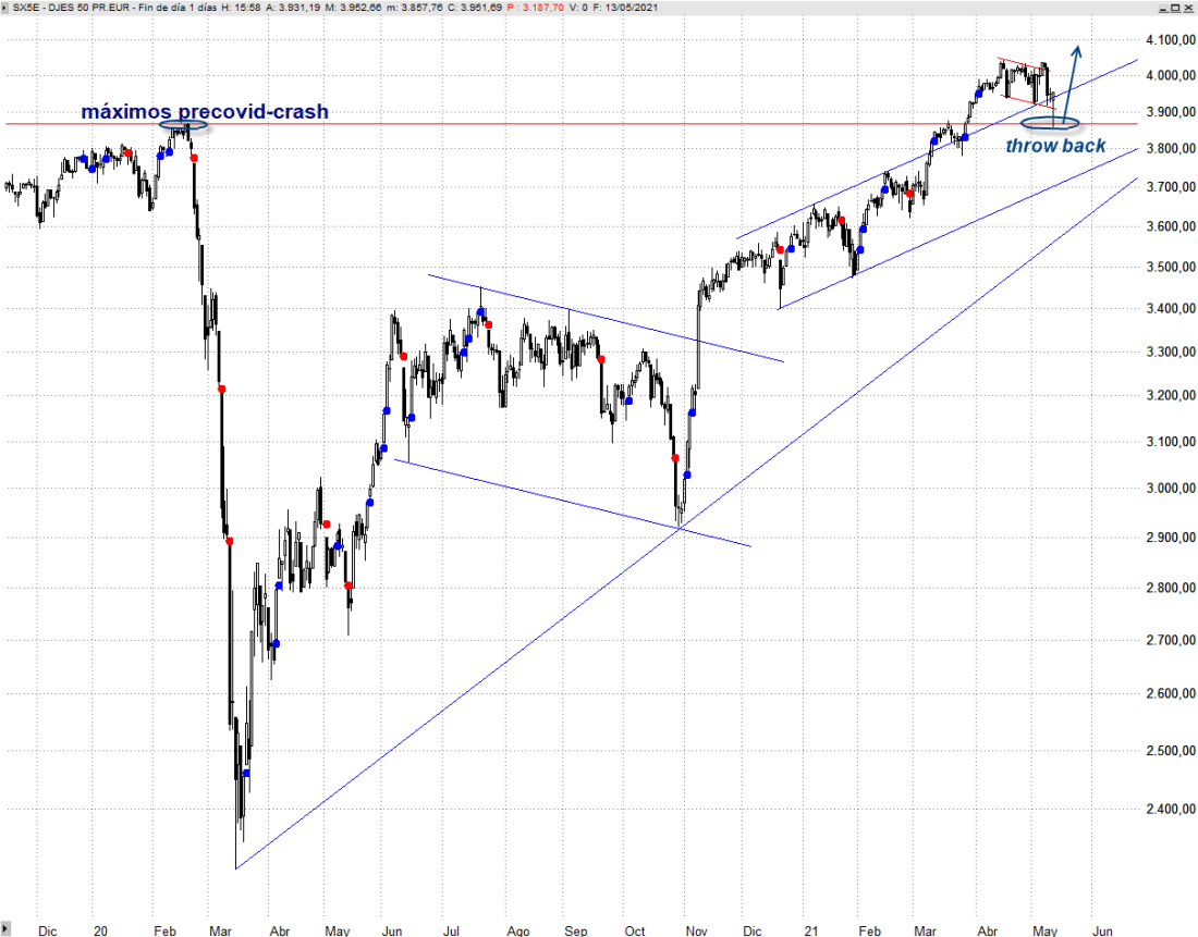 El Eurostoxx 50 ha recuperado al cierre de sesión la base de la consolidación que desarrolla durante las últimas semanas, lo que denota que los bajistas no han podido hacerse con el control. Podríamos decir que hemos asistido a un throw back hacia los máximos precovid-crash, a los 3.867 puntos, tras el cual ha vuelto a aparecer interés comprador. Esto refuerza la idea que venimos defendiendo desde Trader 35 Investment en las últimas semanas, y es que este movimiento sigue encajando con una simple consolidación previa a un nuevo segmento alcista que alcance al menos los 4.095 puntos. Perder los mínimos de hoy ya no tendría ningún sentido en un contexto de fortaleza y confirmaría agotamiento comprador y el inicio de una fase correctiva más amplia.