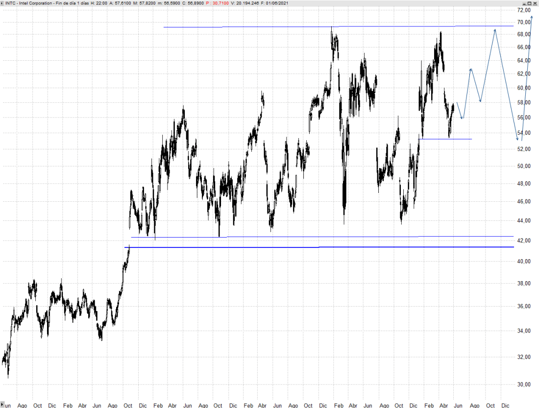 Si a corto plazo logra ya batir los 58 dólares hablaríamos de fortaleza a corto plazo y probablemente se dirigirá a cerrar el amplio hueco bajista abierto a mediados de abril desde los 62,57 dólares, que es lo que tiene que superar para que tome cuerpo un nuevo ataque a los 70 dólares. Cerrando el hueco se alejaría el riesgo de que en próximos meses Intel se dirija nuevamente a poner a prueba su reiterado soporte fundamental. En ese caso ganaría muchos enteros la subida libre absoluta, aunque para ello necesite consumir aún más tiempo entre los 70 y los 53 dólares.