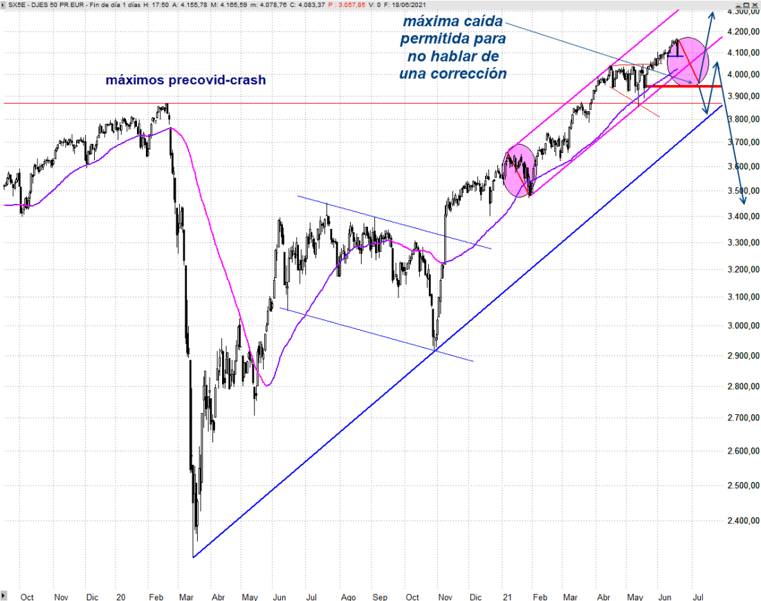 Pues bien, que asistamos a una cierta recogida de beneficios, a una envestida bajista, a una consolidación de niveles que alivie la sobrecompra, seguirá encajando con la continuidad de la tendencia en busca de la zona de los 4.320 puntos de Eurostoxx 50, e incluso los 4.600, en tanto en cuanto no pierda la zona de los 3.955/3.935 puntos. Hablaríamos de una caída similar a la vista a primeros de año, tras la cual la presión alcista podría volver a imponerse.