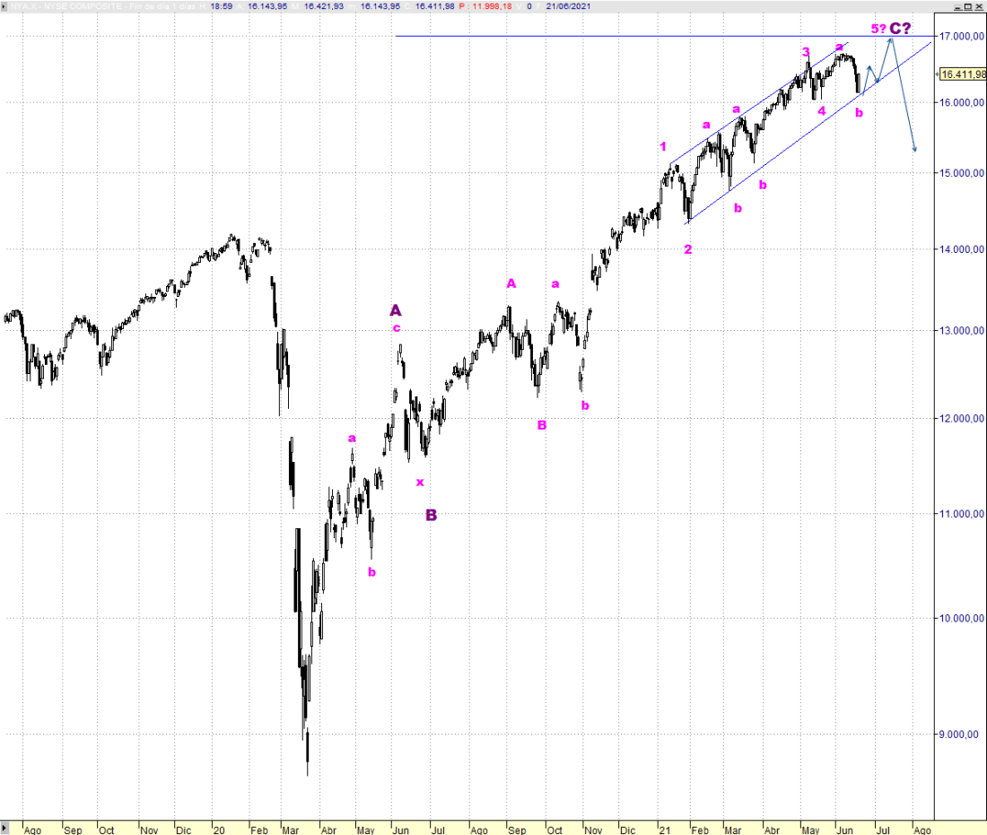 Más pistas sobre la situación generalizada del mercado las obtenemos con el índice Nyse Composite. Su estructura sugiere que aún veremos al menos un nuevo máximo creciente sobre 17.000/17.200 puntos. Amenaza con formar un patrón bajista en forma de doble techo desde la resistencia creciente que discurre por el entorno de precios en el que ha encontrado freno, pero lo que consideramos más probable mientras no pierda los 16.000/15.880 puntos es que la presión alcista logre nuevos máximos con la generalidad del mercado.