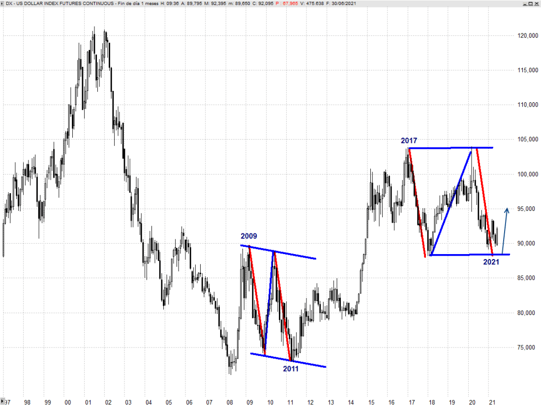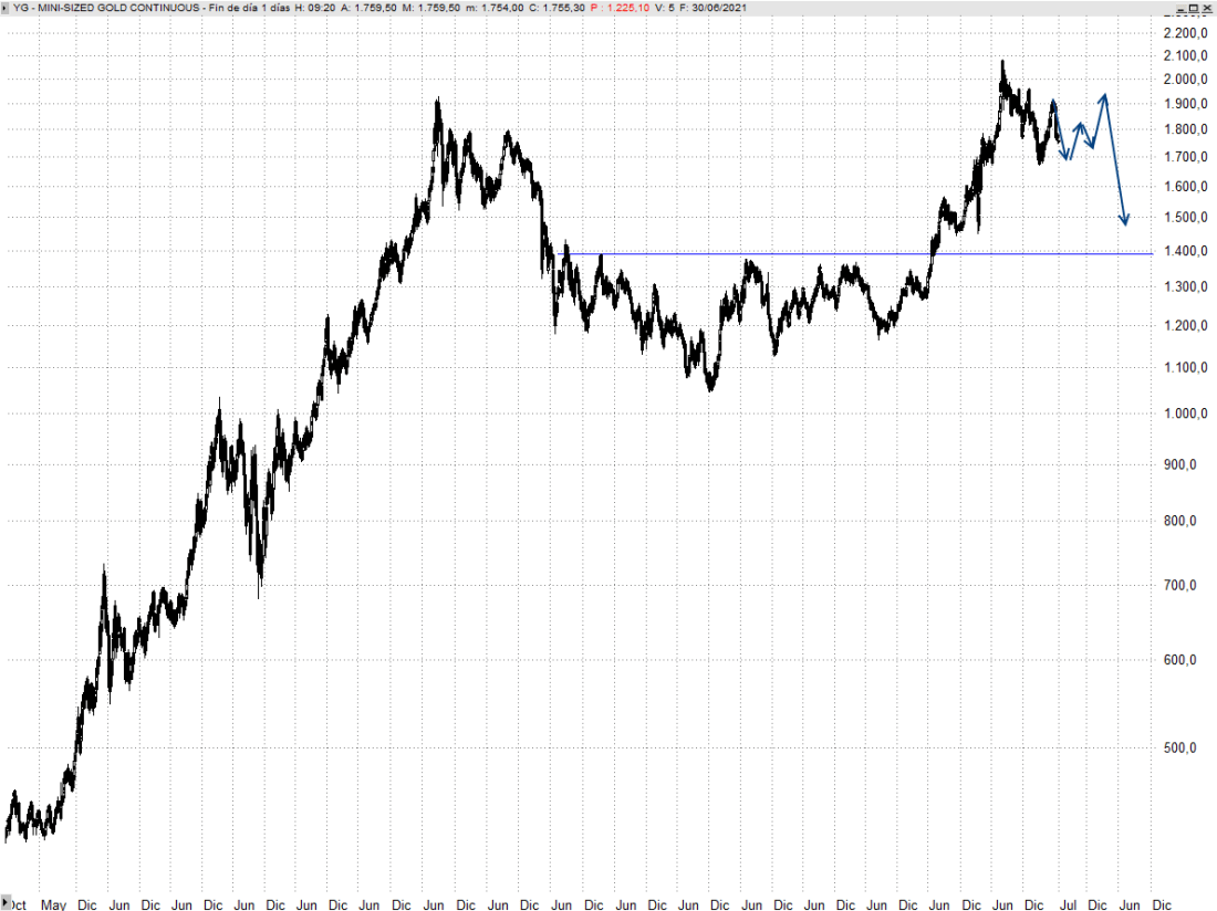 Así se está demostrando este mes de junio con una potente envolvente bajista mensual que amenaza la reanudación de su tendencia a plazos largos. Lo más probable es que el metal dorado se dirija a poner a prueba los mínimos de marzo, los 1.700/1.670 dólares, desde donde podría volver a aparecer interés comprador y formar un nuevo rebote que se dirija a atacar la zona de los 1.960 dólares, pero seguiríamos sin confiar en la reanudación de la tendencia.