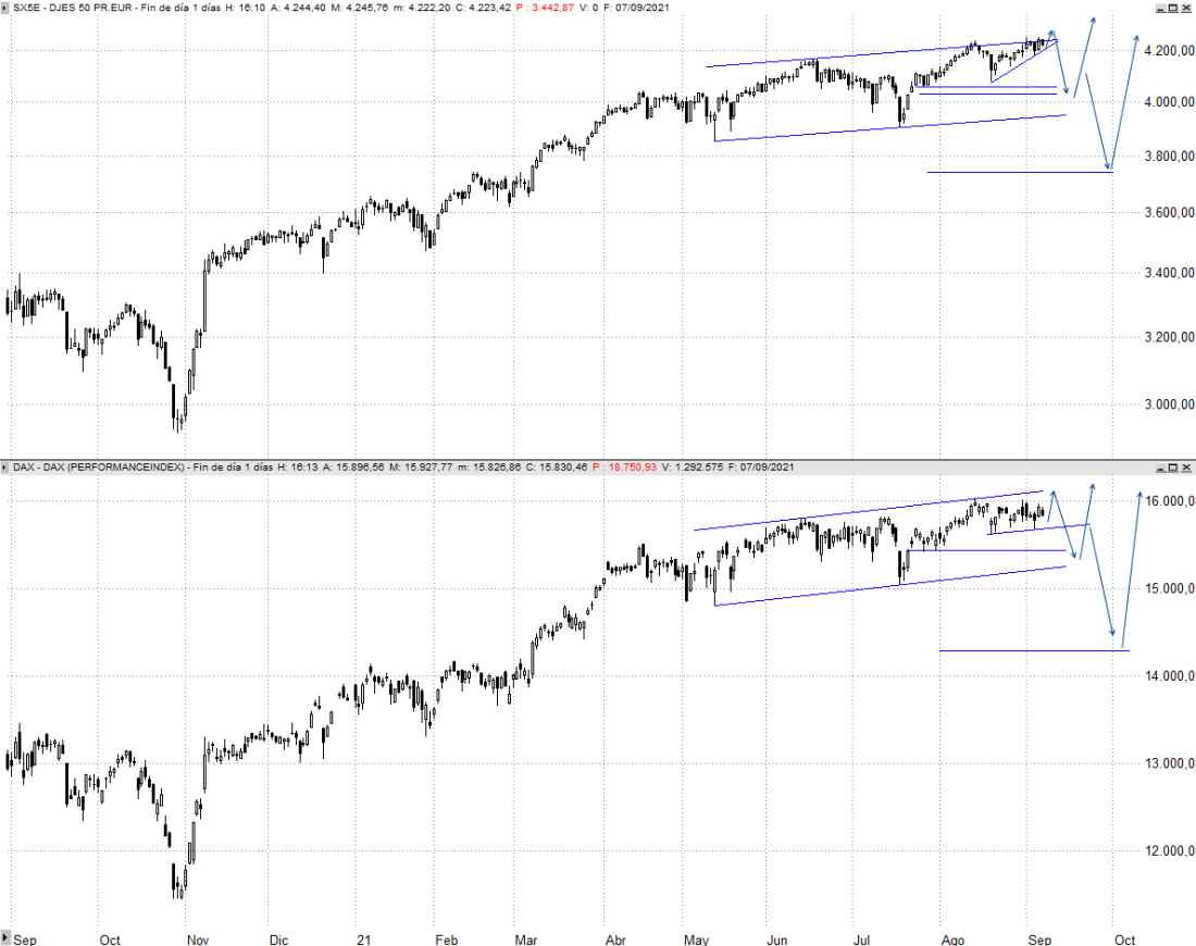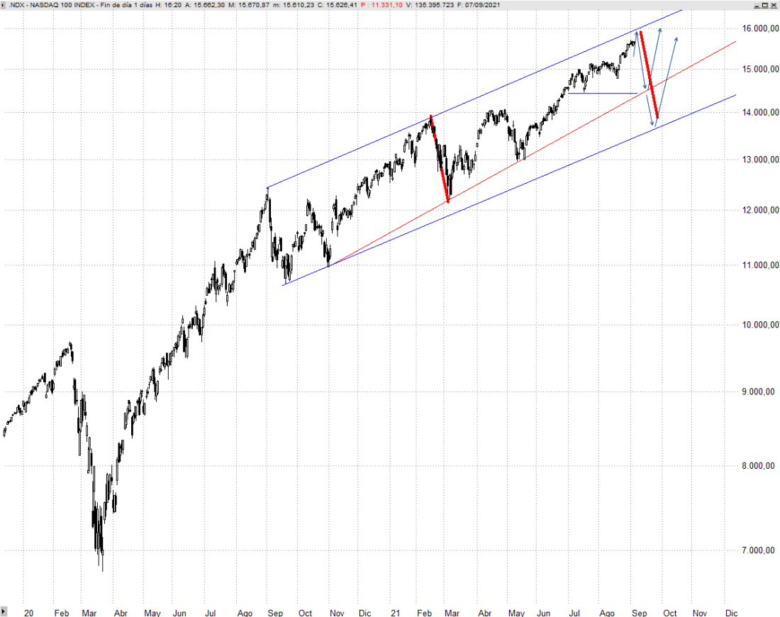 Rebotes al margen, seguimos esperando caídas que podrían dirigirse al menos hacia los 4.070/4.030 puntos de Eurostoxx y los 15.540/15.420 puntos de Dax, cuyo alcance provocaría muy probablemente interés comprador y desde donde ya empezaríamos a plantearnos tomar nuevas posiciones. En el peor de los casos contemplaríamos una corrección del orden del 12% que llevaría al Eurostoxx 50 a la zona de los 3.740 puntos, pero lo consideramos menos probable. Para ello el Nasdaq 100 tendría que formar una corrección proporcional a la vista entre febrero y primeros de marzo de ese año, la segunda opción que contemplamos en el gráfico adjunto hacia la directriz inferior.