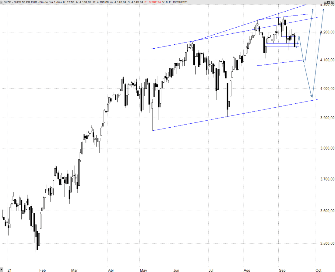 En el caso del Eurostoxx también vigilamos la zona de soporte intermedia de los 4.090/4.080 puntos, cuya cesión provocaría una nueva aproximación a los mínimos de julio, con el peligro que eso conllevaría, pero quiero insistir en que esta consolidación o corrección debemos de verla todavía como una oportunidad de compra de cara al medio plazo. Los alcistas siguen claramente al mando a pesar de su debilidad de corto plazo.