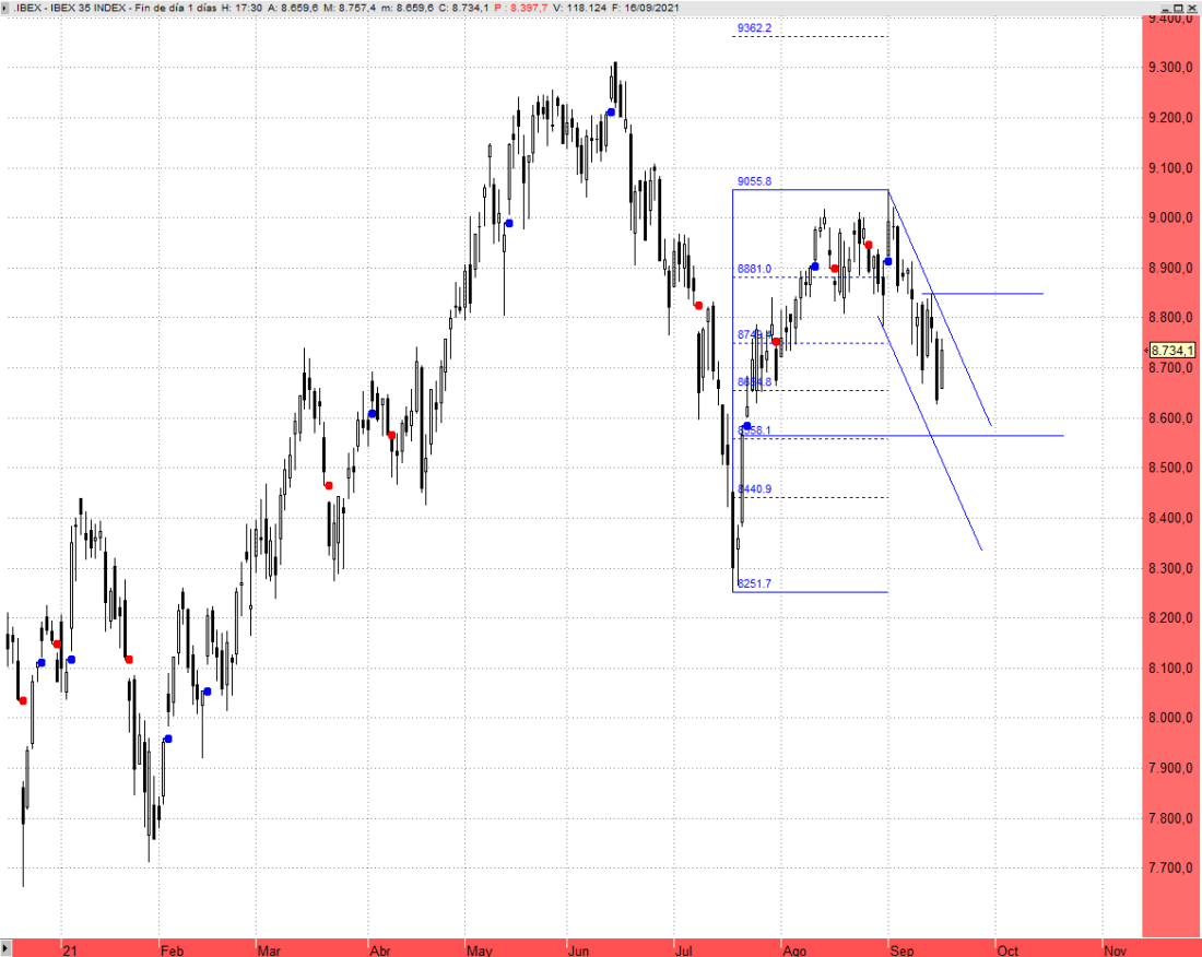 En cuanto al Ibex 35 lo mínimo exigible para hablar de fortaleza a corto plazo es que recupere los 8.950 puntos. Por debajo el primer soporte destacable aparece en el hueco alcista que abrió a finales de julio desde los 8.567 puntos, que prácticamente representa un 61,8% del último segmento alcista destacable entre los 8.250 y 9.055 puntos.
