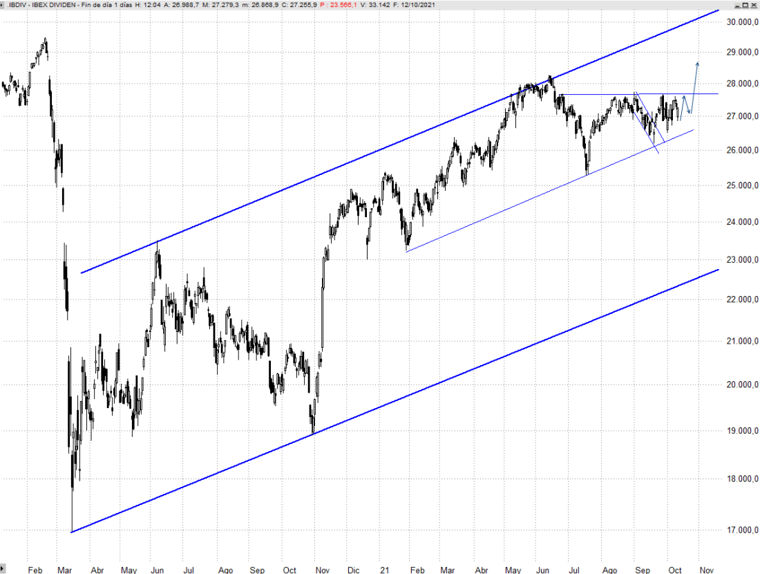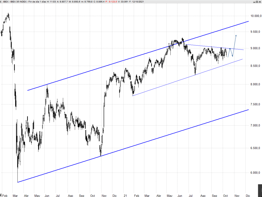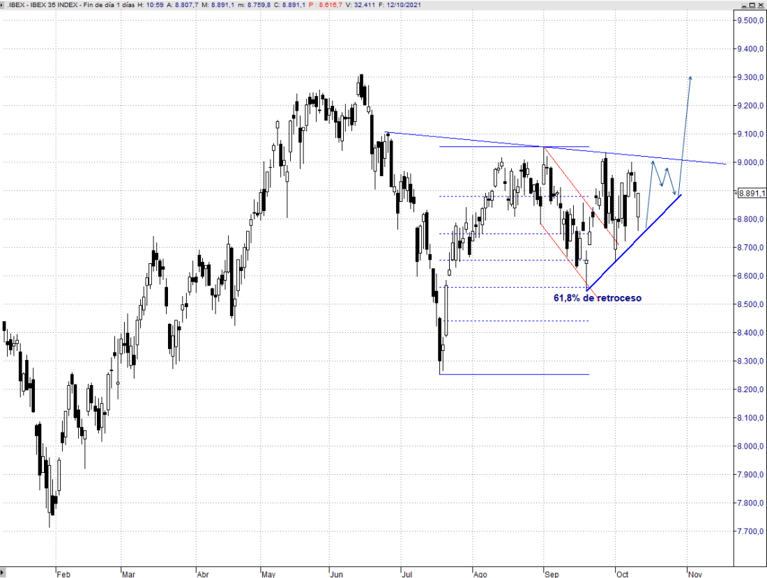 El hecho de que en septiembre canalizara las caídas dentro de una pequeña bandera, que ya ha logrado superar al alza, invitaba a ser optimistas. Los recientes mínimos intermedios en los 8.550 puntos representan un 61,8% del tramo originado desde los 8.250, mínimos de julio, y seguimos entendiendo a pesar de la debilidad que están mostrando las bolsas en el más corto plazo que estamos ante el origen de un movimiento alcista que buscará en próximas semanas los 9.300/9.550 puntos. Podríamos ver varias sesiones más de consolidación lateral antes de batir resistencias, lo que daría cierta simetría a la formación consumiendo tiempo como lo hizo entre mediados de agosto y primeros de septiembre, pero seguimos considerando que el escenario más probable es el alcista.