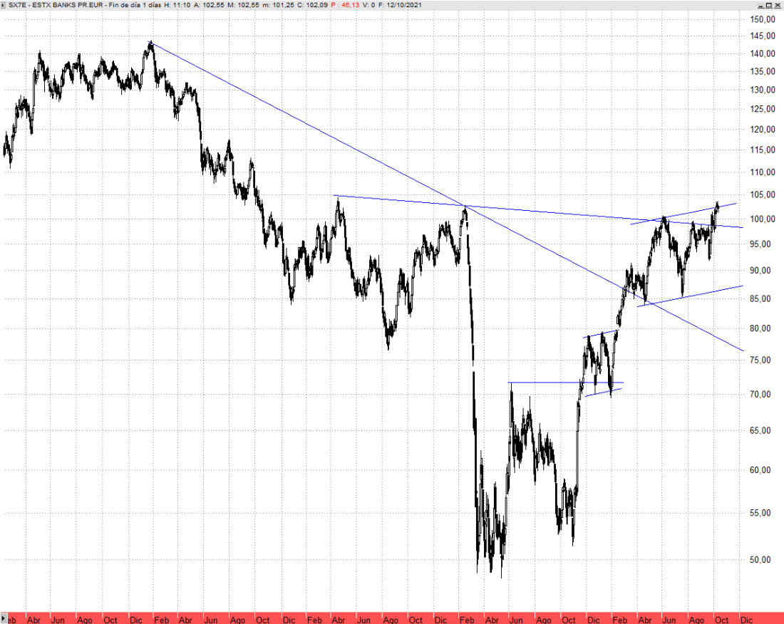 Por tanto, seguimos siendo optimistas con el selectivo español, máxime cuando el sector bancario europeo está logrando en las últimas sesiones marcar máximos crecientes atacando ya niveles previos al Covid-Crash, como es el caso del índice SX7P y SX7E. Ya saben que el Ibex 35 es un índice muy bancarizado y es también un argumento favorable para sus aspiraciones.