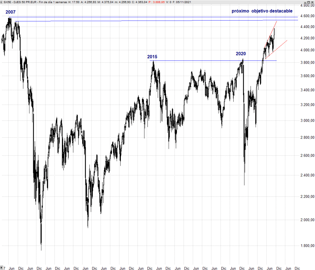 Confiamos en que aún no hemos visto techo a la subida originada en marzo de 2020, pero es evidente que ya queda menos para su agotamiento y, a corto plazo, no nos sorprendería ver próximamente una consolidación o corrección de parte de las últimas subidas originadas a primeros de octubre, tal y como plasmamos en el anterior articulo del pasado día 30 de octubre.
