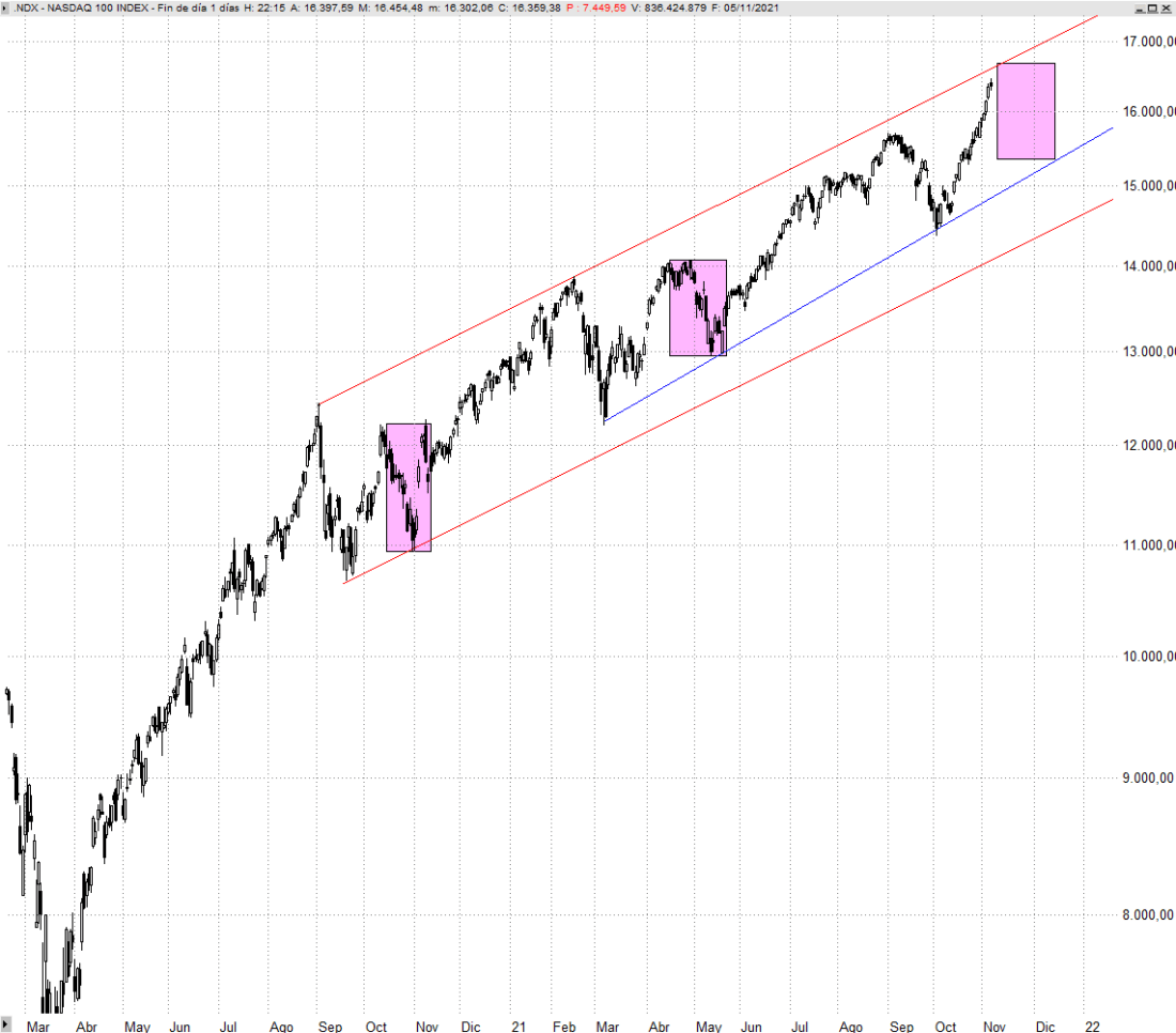 La zona de los 16.500 puntos de Nasdaq no será fácil de superar. Si lo hace seguiremos disfrutando de la tendencia y podríamos ver incluso una aceleración de las subidas, y si corrige de una forma similar a como lo hizo en octubre del año pasado y en mayo de este, pues aprovecharemos para seleccionar algunos títulos más en los que buscar compras, pero ya sin demasiadas pretensiones de permanencia.