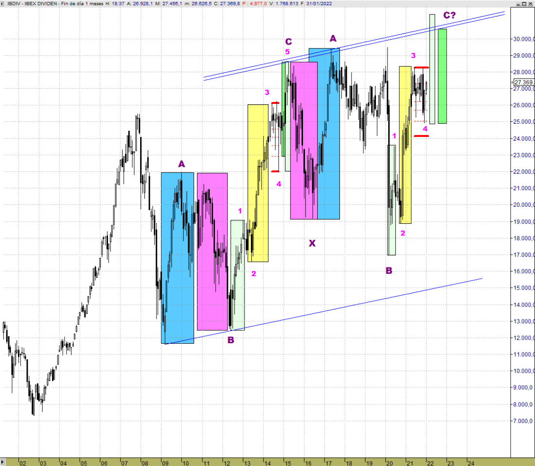 En colación a un gráfico que he publicado en el cierre de sesión sobre el Ibex 35 en escala aritmética, tengo el gusto de compartir con todos vosotros un gráfico que no perdería de vista. Hablo del Ibex 35 en su versión con Dividendos también en escala aritmética.
