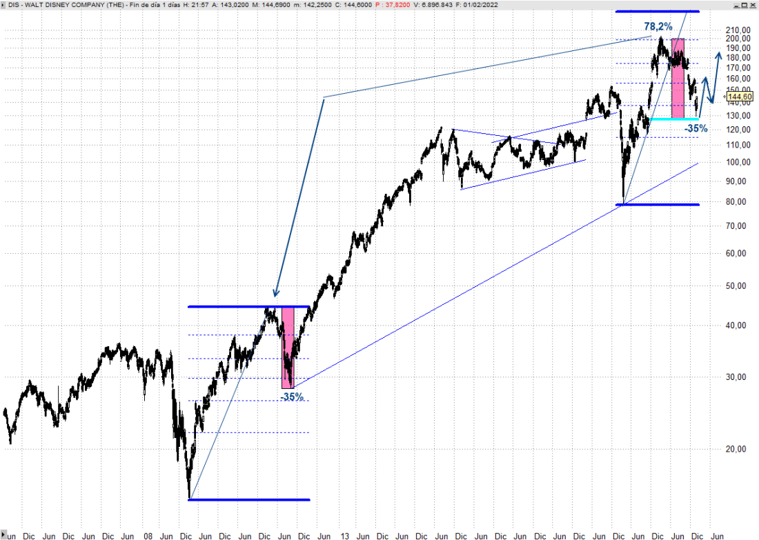 Pues bien, previamente a esa corrección de 2011 prácticamente triplicó su valor desde los mínimos de 2009 en un movimiento de arranque de tendencia también proporcional al que hemos visto desde los mínimos de marzo de 2020, desde los 79 dólares hasta los 200. Hablamos de una proyección del 78,2% de aquel movimiento, por lo que podríamos estar ante una situación similar a la que tenía Disney en 2011 cuando reaccionó desde los 30 dólares.