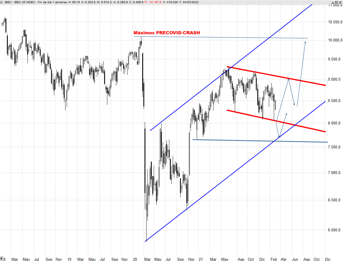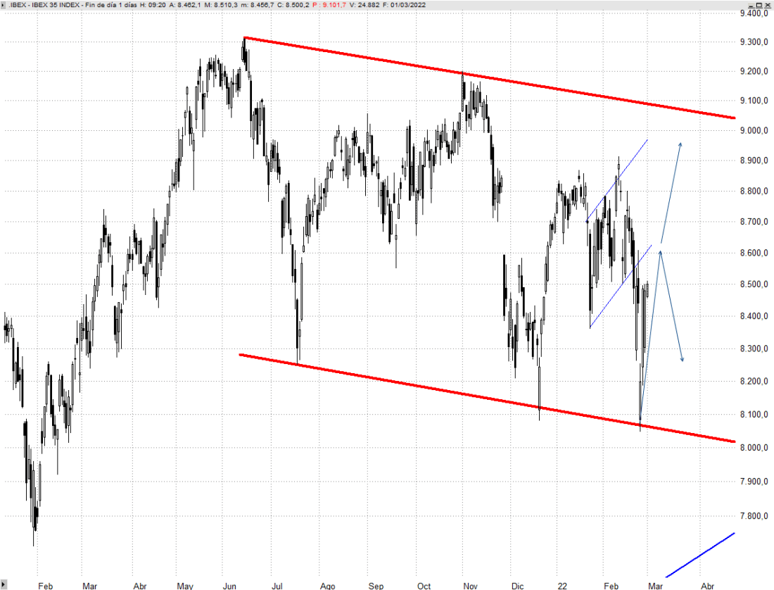 El conflicto bélico en Ucrania tiene en vilo al mundo y a las bolsas. La pasada semana asistimos a un potente ataque bajista que llevó al Ibex a poner a prueba la base del movimiento lateral que desarrolla en los últimos meses. Hablamos de los 8.050 puntos, por donde discurre la banda inferior con ligera pendiente descendente que mostramos en el gráfico adjunto.