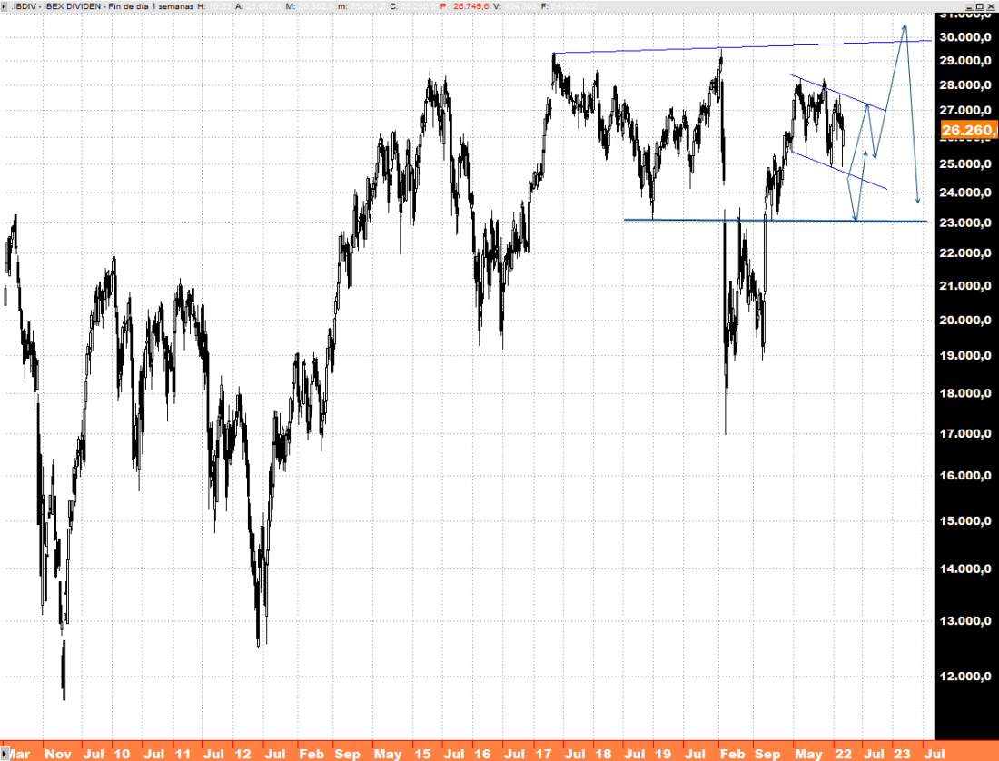 Mientras resistan los soportes a los que hacemos mención, la base del lateral y sobre todo la zona de los 7.700 puntos, seguiremos confiando en el escenario que hemos venido defendiendo en los últimos meses. Esto es un primer ataque a los 9.000 puntos para posteriormente buscar los máximos precovid sobre los 10.100 puntos. Seguimos viendo de cara a próximos meses al Ibex en su versión con dividendos atacando el entorno de los 30.000 puntos. Después de eso ya podría venir una corrección de orden mayor, pero de momento las caídas siguen siendo controladas y sus opciones se mantienen intactas.