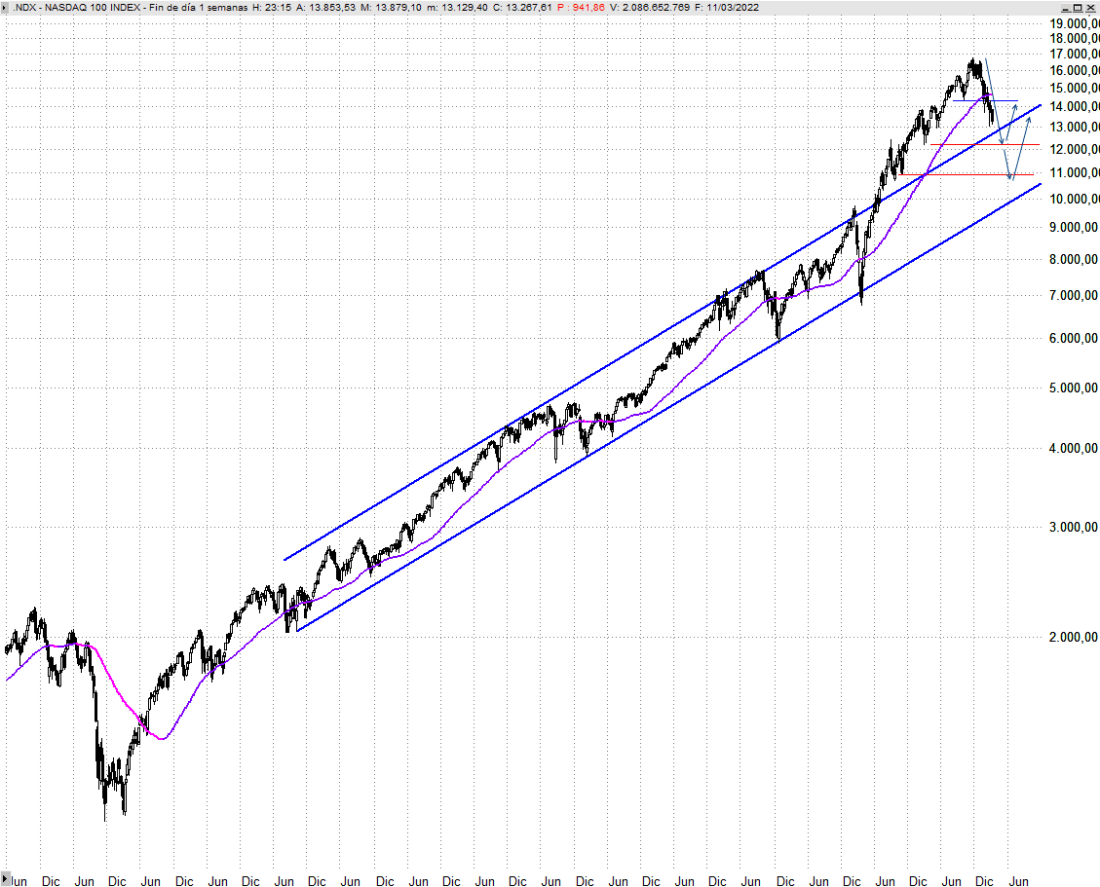 A corto plazo amenaza con marcar nuevos mínimos decrecientes bajo los que marcó en la jornada del pasado 24 de febrero, jornada que quedará marcada para la historia por la invasión de Ucrania. Ceder la zona de los 13.000/12.950 puntos abriría la puerta a caídas hacia los 12.300/11.800 puntos, lo que nos dejaría una caída prácticamente idéntica a la que provocó la pandemia. Ese sería un escenario optimista, puesto que la estructura que nos está dejando la curva de precios plantea potenciales caídas que podrían ir hacia los 11.000 puntos. Esto representaría una caída de aproximadamente el 35% desde máximos.