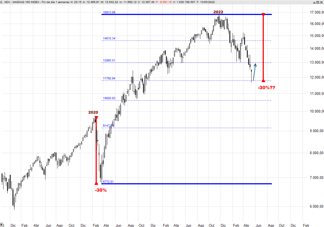 Si nos fijamos en el propio Nasdaq 100, la parte más fuerte del mercado en los últimos años, ahora más débil a corto plazo, ya ha corregido el 50% de la serie de Fibonacci, dejándose un 30% desde los 16.764 puntos a los 11.692 puntos marcados como mínimos esta semana. Este descenso del 30% es prácticamente lo mismo que se dejó el Nasdaq 100 con el estallido de la pandemia, otro 30%.