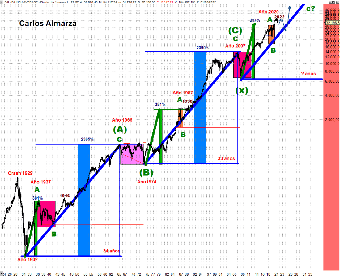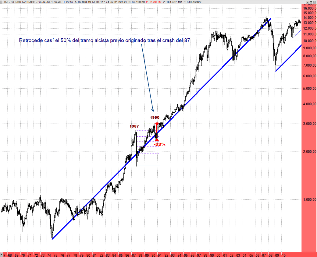 Esta corrección de 2011 puede ser considerada como lo más parecido al actual contexto en los últimos años, pero realmente habría que trasladarnos a 1946 y 1990 para ver correcciones estructurales que encajan dentro del gran superciclo del que les hablo. En 1946 el Dow Jones Industriales retrocedió un 24% de su cotización, un ajuste del tramo previo de entre el 38,2% y el 50% de la serie de Fibonacci. En 1990 el Dow Jones Industriales retrocedió un 22%, realizando también un ajuste de entre el 38,2% y el 50% de la serie de Fibonacci.