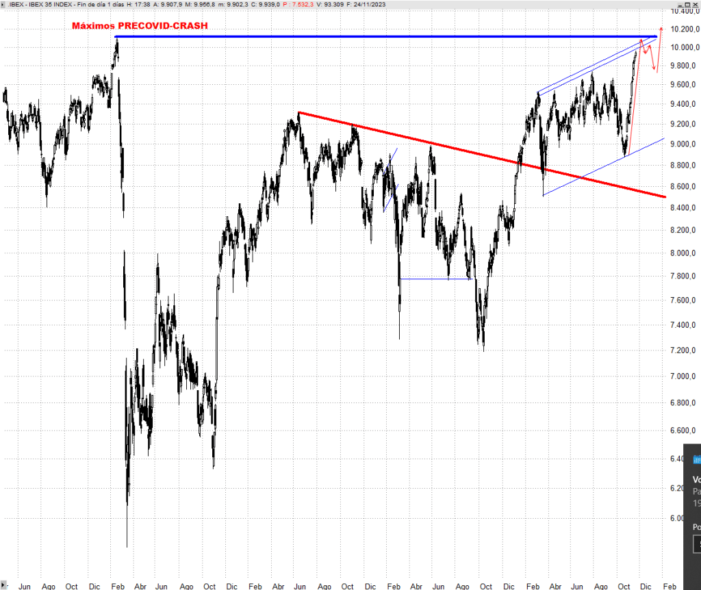Ya lo advertíamos en la anterior revisión del selectivo español, que buscaríamos un patrón de vuelta confiando en una vuelta a los 10.000 puntos para recuperar los niveles previos al estallido de la pandemia en marzo de 2020. Los principales índices europeos hace tiempo que ya lo han superado, y el Ibex 35 lo tenía pendiente.