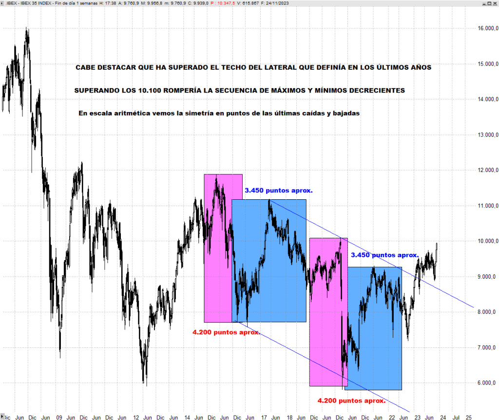 Vean en este gráfico de abajo, en escala aritmética, como está superando el canal bajista que venía definiendo en los últimos años. Superando los 10.100 puntos rompería la secuencia de máximos y mínimos decrecientes. Cabe destacar lo “curioso” que es que podamos identificar dos tramos bajistas coloreados en rosa prácticamente idénticos en puntos, 4.200 puntos de caída, y dos tramos alcistas coloreados en azul de 3.450 puntos respectivamente de subida. ¡Muy curioso! Por eso siempre digo que no existen verdades absolutas en Análisis técnico, y que tanto en escala logarítmica como en escala aritmética se puede obtener información.
