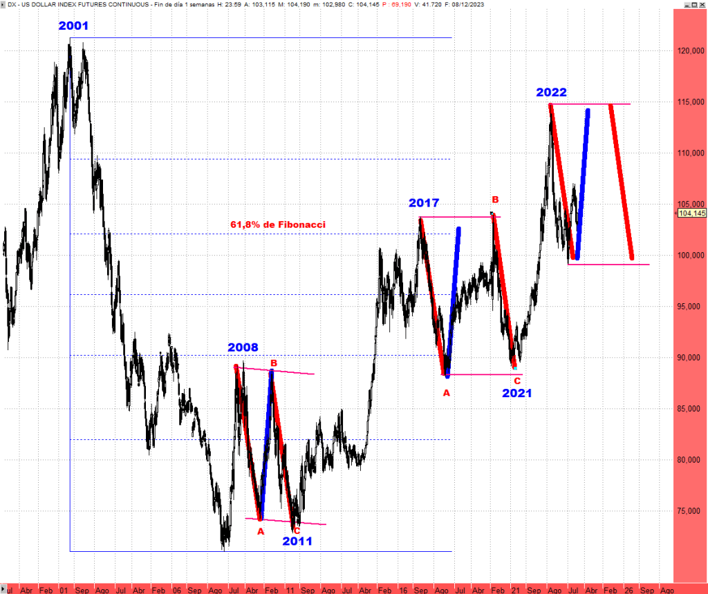 Desde ahí formó un potente giro al alza a primeros de 2021 hasta la zona 114 puntos, y lo curioso es que posteriormente ha vuelto a formar un tramo correctivo muy similar a los que señalo en rojo en los dos anteriores grandes tramos laterales.