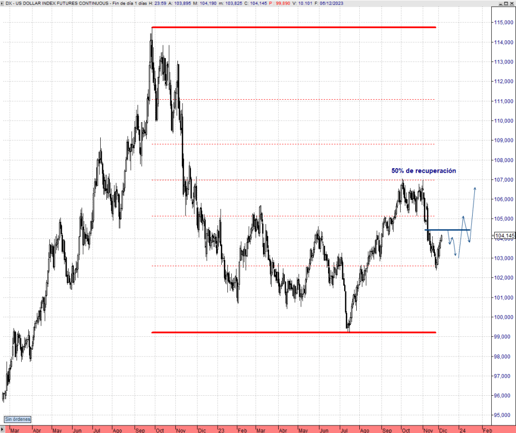 Pistas que apuntarían a corto plazo a la reanudación alcista del Dollar Index sería la superación del nivel 104,50.