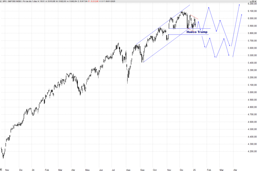Las fuerzas están igualadas en el corto plazo entre compradores y vendedores, pero la tendencia sigue siendo indiscutiblemente alcista a medio y largo plazo. Estamos ante una consolidación de precios, y aunque está latente la amenaza de un pequeño giro correctivo que podría provocar caídas hacia los 5.660/5.550 puntos de S&P 500, los soportes de corto plazo se mantienen en pie, y sobre todo, se mantiene abierto lo que denomino el “hueco Trump”, hueco que abrieron las bolsas estadounidenses a primeros de noviembre tras la victoria electoral de Donald Trump.