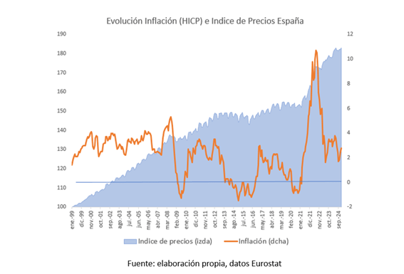 Desde la creación del euro en 1999, la inflación media de España ha sido del 2,3%. Puede parecer que no es elevada, pero el índice de precios al consumo en España, o inflación acumulada, ha sido del 83%, aunque no todas las partidas han incrementado sus precios al mismo ritmo. En dicho periodo, la alimentación ha aumentado su coste un 187%, y los suministros domésticos (agua, electricidad, gas y combustibles) han doblado su coste, mientras que las comunicaciones han reducido su precio un 27% en esos 25 años.