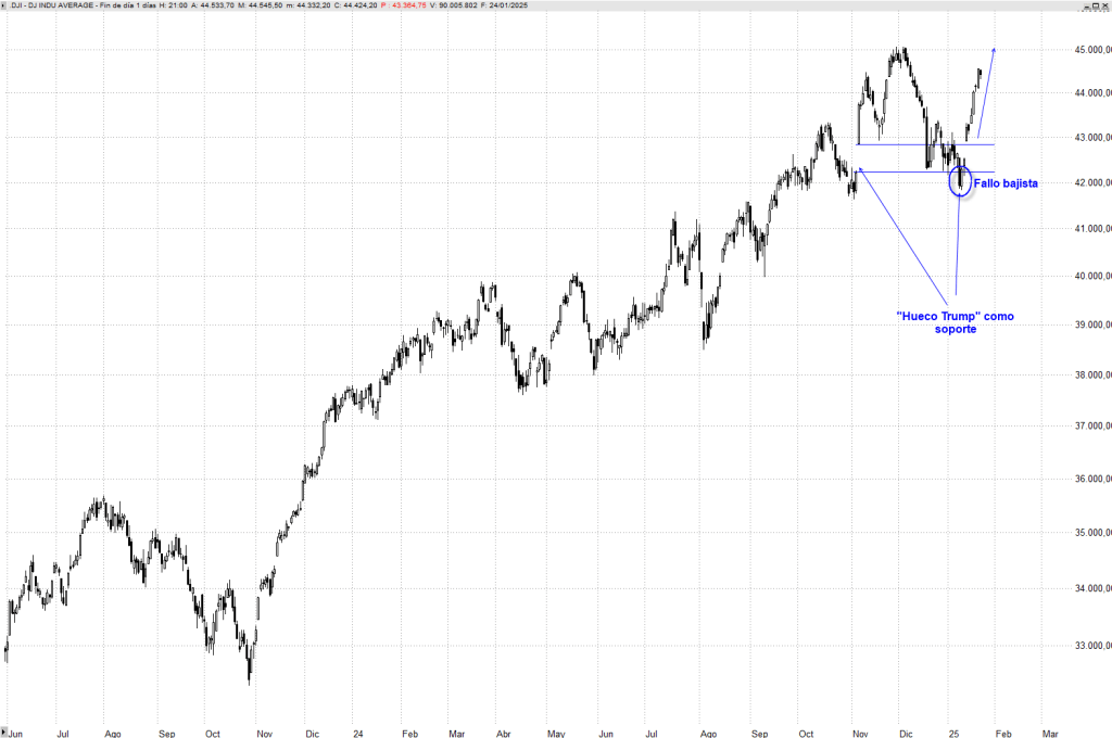 En el caso del Dow Jones, el índice de mayor debilidad en los últimos meses en comparación con S&P 500 y Nasdaq 100, fue incluso cedido puntualmente en la sesión del pasado 10 de enero, en lo que podríamos considerar que fue un fallo bajista, un fracaso de la presión vendedora por extender una corrección más amplia. Y ya saben, un “fallo bajista” es una señal alcista, que refuerza la tendencia.