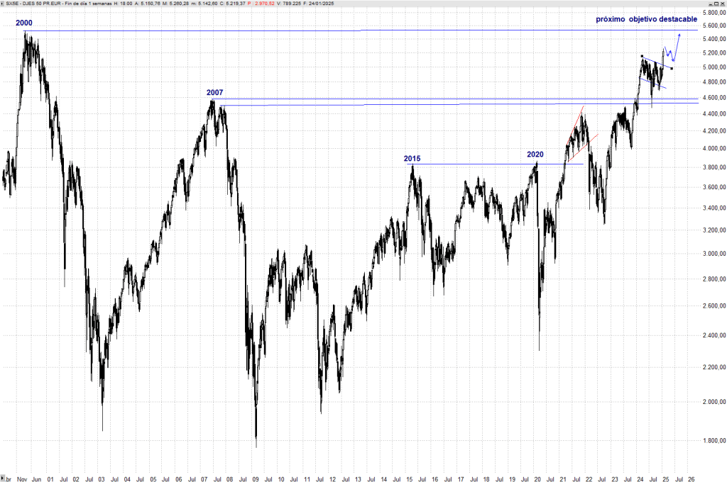 El Eurostoxx 50 ya ha puesto en el punto de mira los máximos del año 2000 sobre los 5.522 puntos, a casi un 6% de distancia del cierre del viernes.