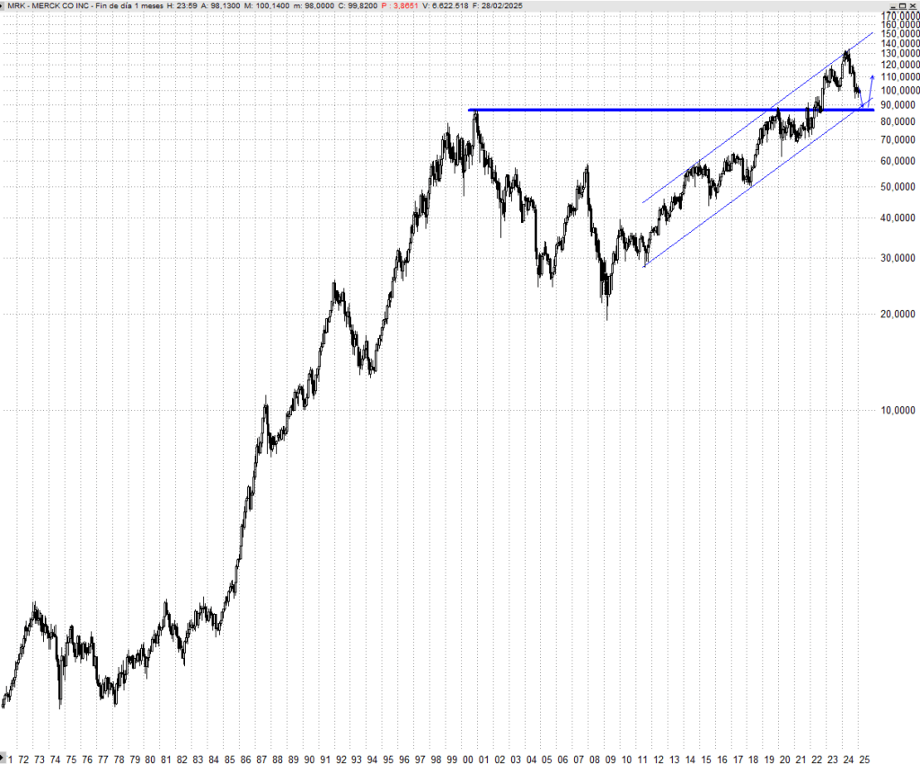 A lo sumo podría poner a prueba los 85 dólares, pero desde este entorno no nos sorprendería que apareciera interés comprador, teniendo en cuenta que en los últimos años, desde los mínimos de 2009, las correcciones de Merck han sido réplicas prácticamente idénticas en tamaño, correcciones de aproximadamente un 30%, en 2010, 2015, e incluso 2020.