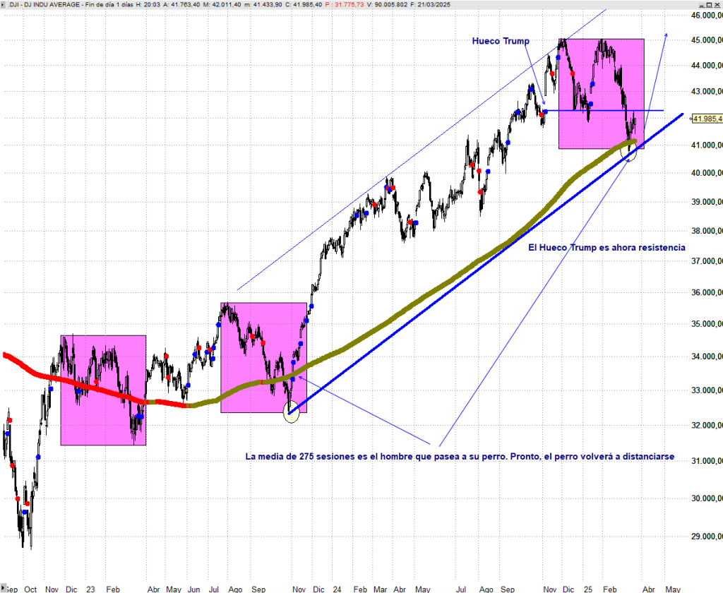 La dirección del dueño, bien podría ser la media de 275 periodos de la que hablamos, y el perro simboliza las cotizaciones, mucho más volátiles con sus idas y venidas. En este caso el perro ha venido a aparejarse con su dueño, con la citada media de 275 sesiones, y a buen seguro que volverá divertido a olisquear más alejado. Esperemos que se aleje hacia los 46.000 puntos de Dow Jones y en segunda instancia los 48.100 puntos, subidas del orden del 15% desde los niveles de cierre del viernes. Veremos, y como decía Frank Furillo a sus agentes de policía en la icónica serie “Canción Triste de Hill Street” «Let’s be careful out there», «tengan cuidado ahí fuera”, y no se casen con ningún escenario. Al mercado siempre hay que tenerle respeto, no miedo, pero si mucho respeto.