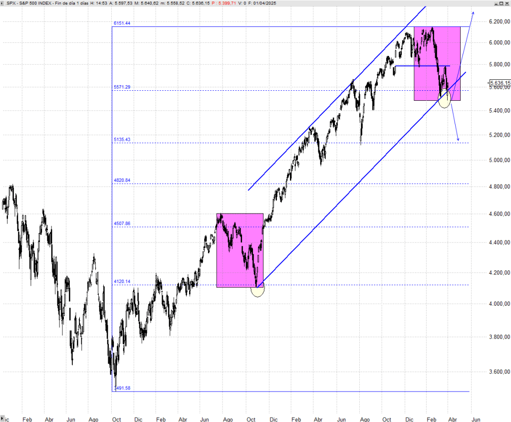 Ayer asistimos a un rechazo de las ventas tras una apertura bajista, que concede cierto margen a ser optimistas, pero desde luego no da ninguna garantía. Hasta el día de hoy, la corrección desarrollada en los últimos meses la veo todavía como algo del todo normal. Ahora bien, ceder los mínimos de ayer de forma generalizada abriría la puerta a una corrección más amplia que nos haría pensar, no en una replica de la corrección del verano de 2023 como la vista hasta ahora, sino en una proyección proporcional a la vista en 2022, o de cuanto menos una caída hasta la zona de los 5.100 puntos del S&P 500, lo que representaría una corrección del 16/17% desde máximos, un retroceso del 38,2% del tramo alcista originado en los 3.490 puntos. Una réplica de la corrección de 2022 supondría ver caídas hacia los 4.700 puntos, por lo que no es algo menor.