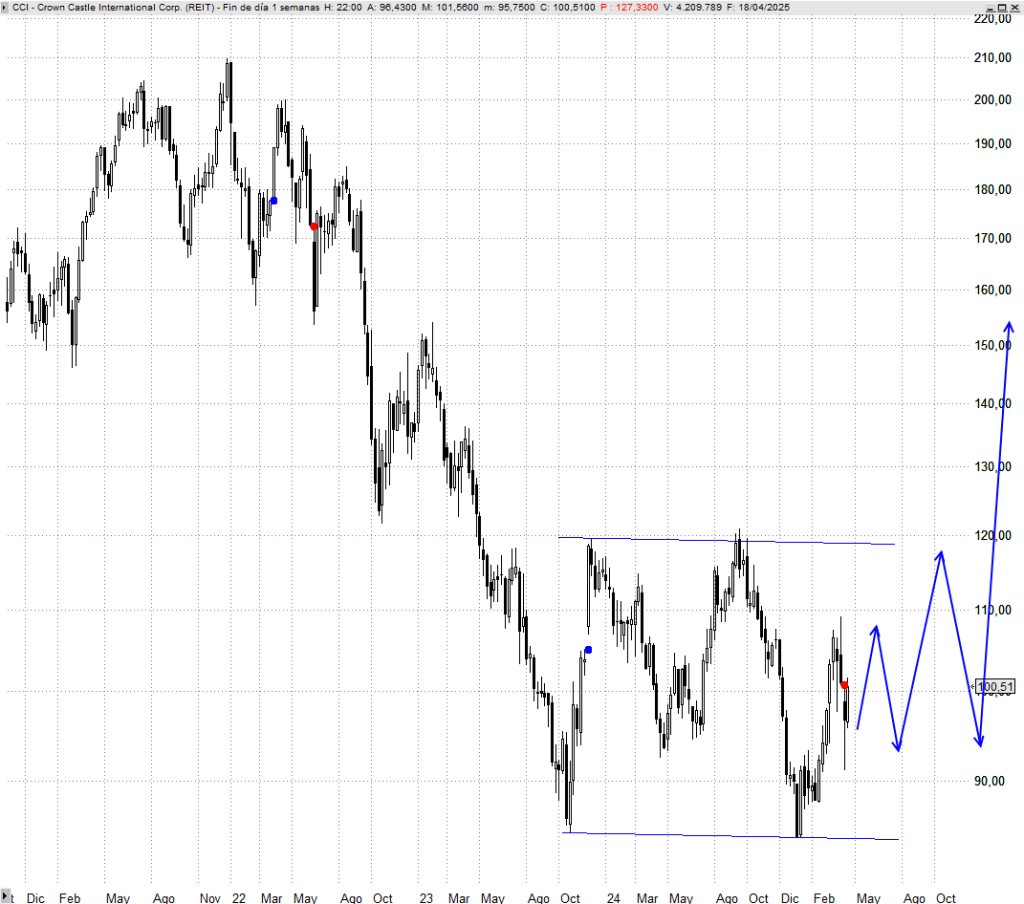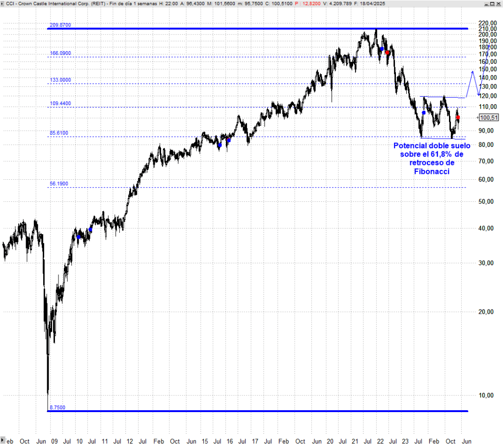 Un título que en la pasada década lo hizo bastante mejor que el S&P 500 y que desde primeros de 2022 está sufriendo una profunda corrección es Crown Castle Inc.