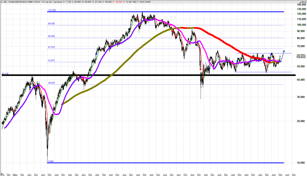 Por otro lado, vigilamos también la matriz Anheuser Busch Inbev, puesto que si supera los 62 y sobre todo los 67 euros, confirmaría un amplio giro que favorecería la reestructuración de Ambev.