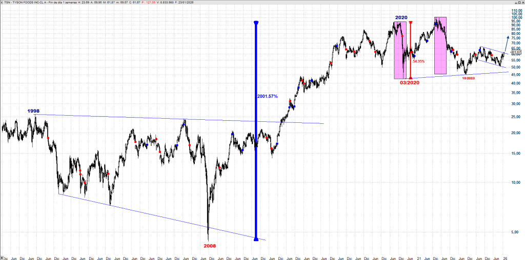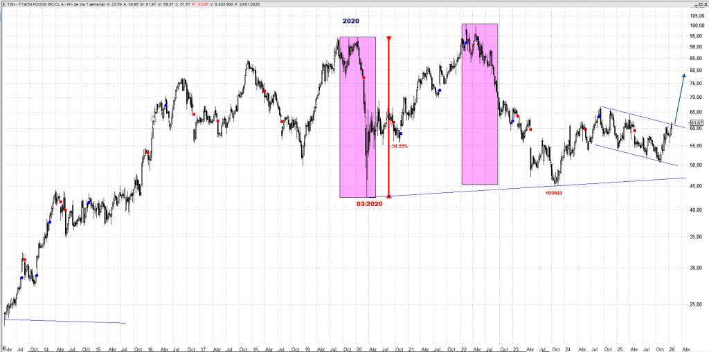 Interesante patrón en Tyson Foods, multinacional líder en alimentos, especializada en productos proteicos que opera como uno de los mayores procesadores y comercializadores de pollo, ternera y cerdo del mundo.