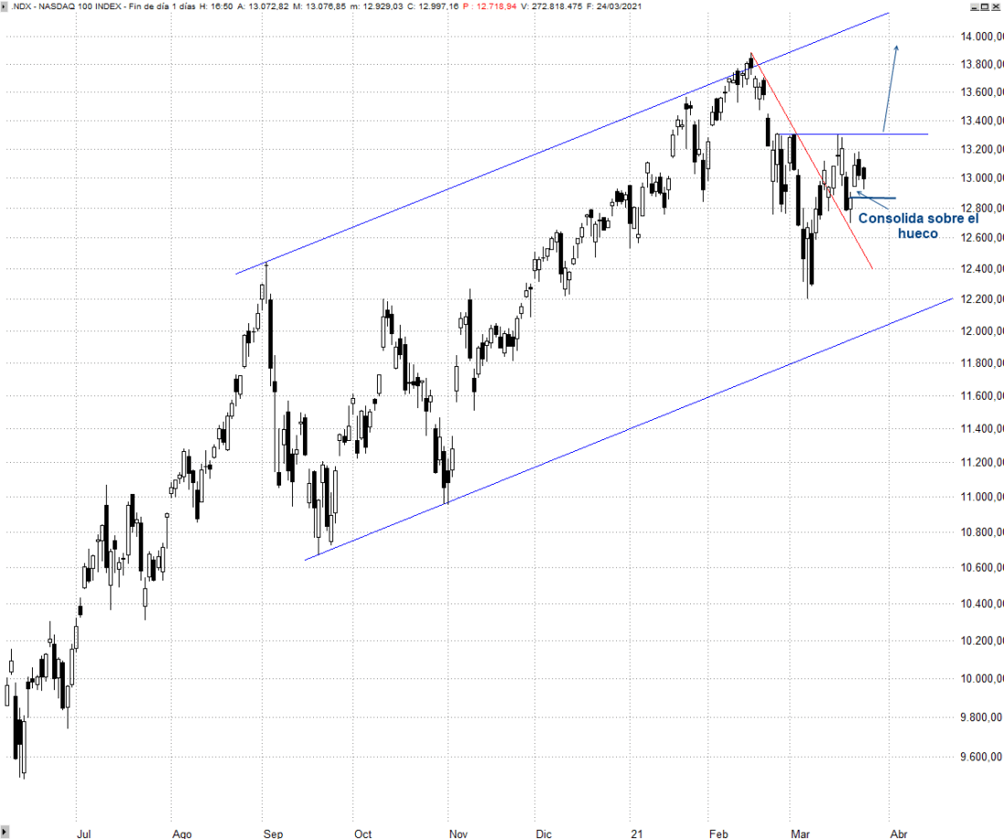 Estamos muy pendientes de lo que acontezca al otro lado del Atlántico, sobre todo con el Nasdaq 100, que debe de batir los 13.300 puntos para abrir la puerta a un nuevo ataque a sus máximos históricos, lo que a buen seguro favorecería la ruptura de resistencias de los índices europeos y al menos un rebote significativo en el Ibex 35. Perder los 12.725 puntos no sería buena noticia para las aspiraciones alcistas, luego es algo a vigilar muy de cerca que puede marcar el comportamiento generalizado de las bolsas en próximas semanas. La ruptura al alza sigue siendo el escenario más probable, aunque nos tememso que aún podría tomarse varias sesiones antes de resolver su situación a corto plazo, bien por encima de los 13.300 o por debajo de los 12.725.